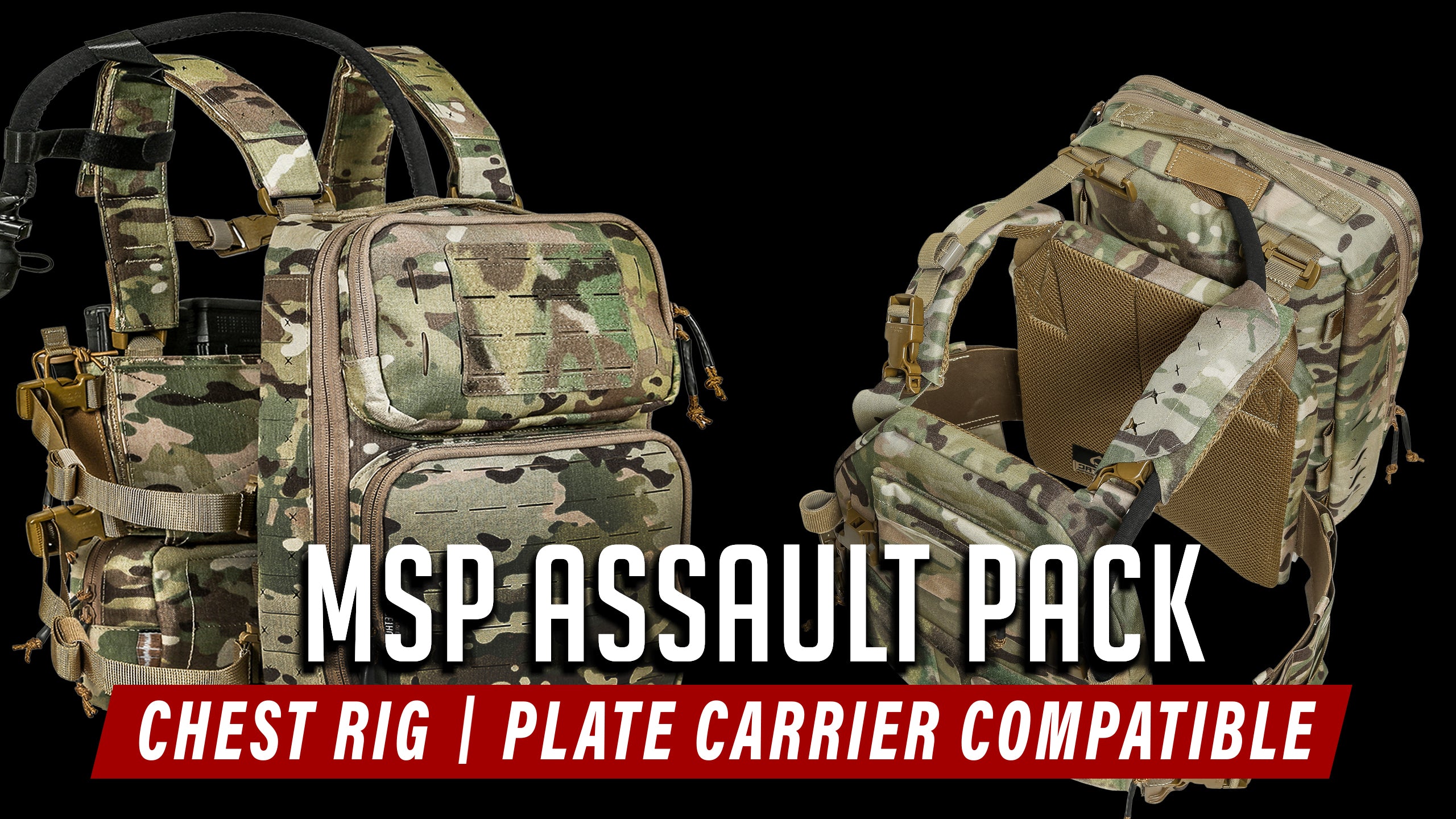 M.S.P. (Mission Support Pack) is a slick, lightweight, and modular assault pack designed for ultimate mission adaptability. Fully compatible with our S.O.P. Micro Chest Rig or most chest rigs on the market, as well as the LPPC V.2 Plate Carrier.