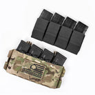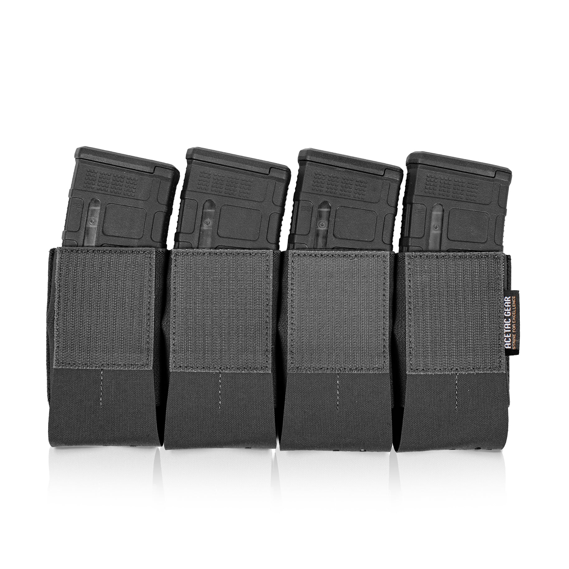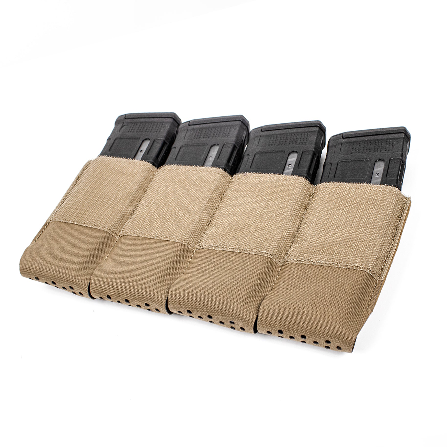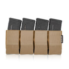 The Quad 5.56 Magazine Insert is a closed-bottom elastic insert constructed from nylon laminate and mil-spec elastic. This combination provides a more structured design compared to traditional elastic magazine inserts on the market. Each magazine cell has a partially open mouth, allowing for smoother and easier magazine reindexing.