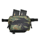 THE SWAG™ V2 fanny pack measures 8.25''(L) x 5.25''(W) x 2.25''(D), equipped with three compartments: a main zipper pocket, a front zipper pocket, and a rear Velcro kangaroo pocket. The main compartment is capable of store sub-compact handguns like the M&P Shield, Glock 26, and similar models. The main pocket features one side completely lined with Velcro, allowing users to customize it with various Velcro inserts. The opposite side includes a built-in inner pocket with an 3-loop elastic organizer. Additionally, the base of the SWAG V2 incorporates a 4-inch elastic sleeve, perfect for securely holding a TQ or items of similar size.
